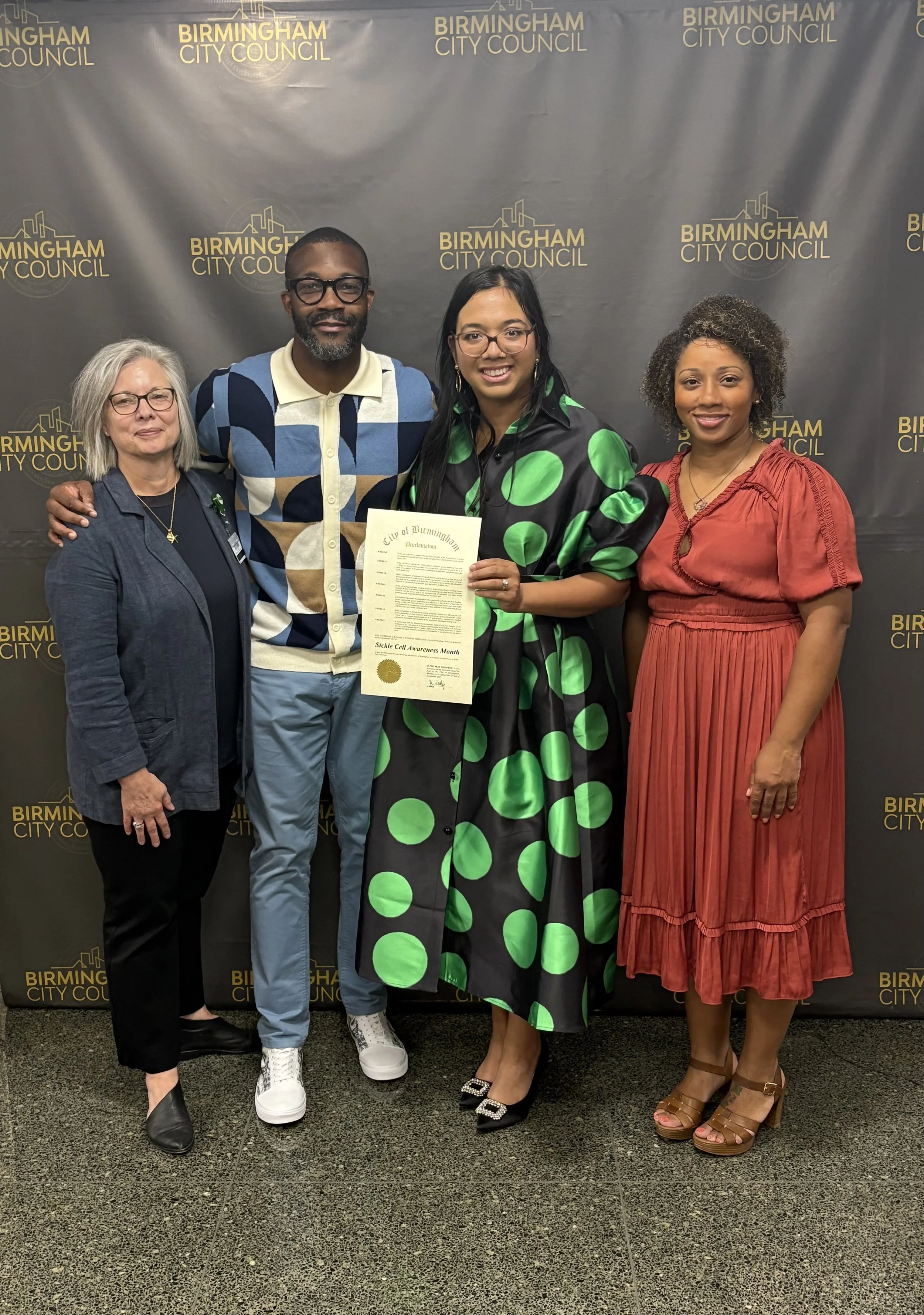 Pictured: Executive Director Sophia Leverson, Mayor Woodfin, Sharon Likos and Sonja Smith of UAB Lifespan Comprehensive Sickle Cell Center.